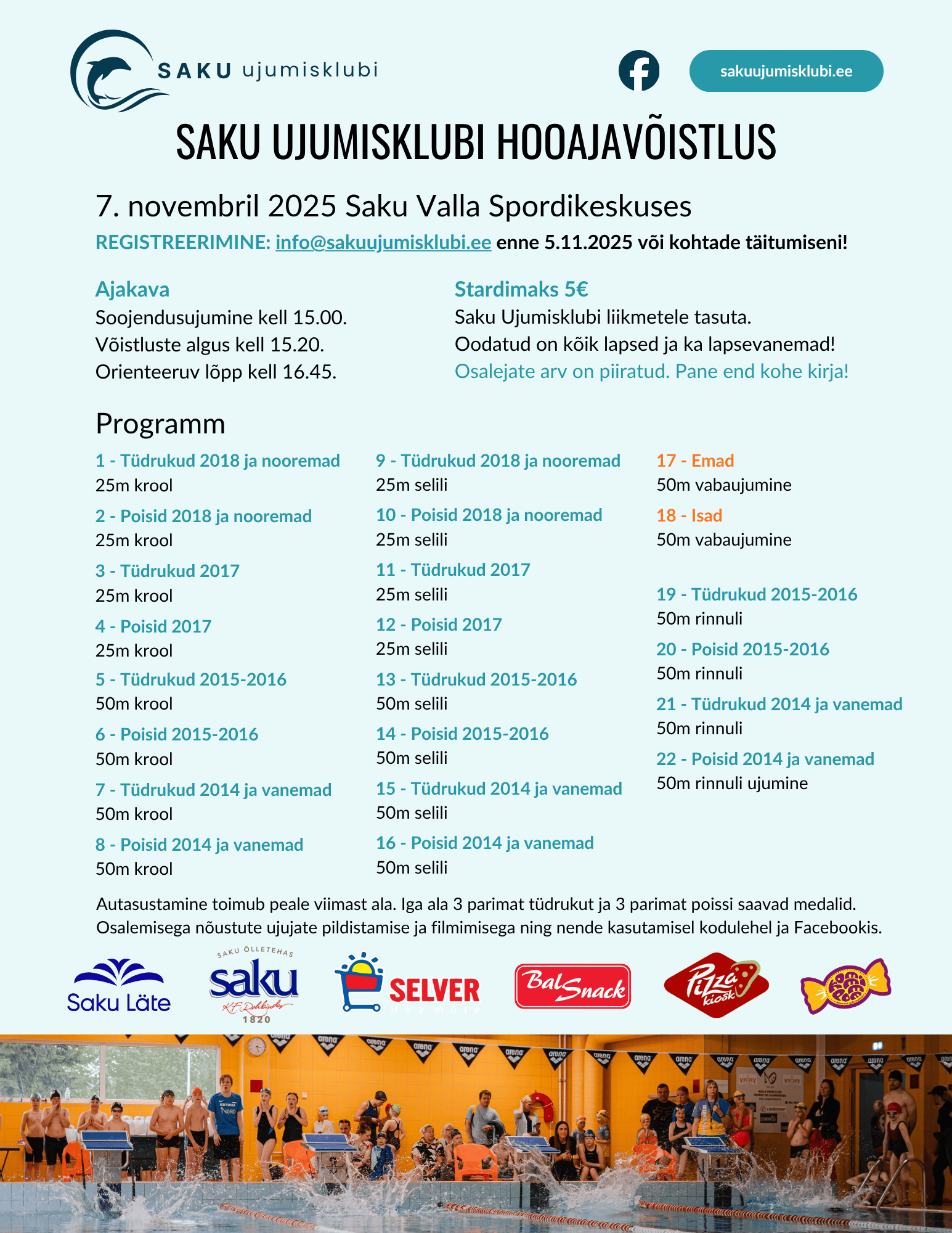 Saku Ujumisklubi võistlused hooajal 2025/2026 toimuvad: 7. novembril sügisvõistlus, 13. veebruaril talvevõistlus ja 8. mail kevadvõistlus.